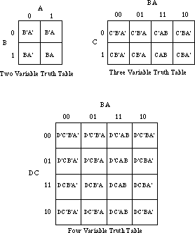 Warning: Take a careful look at these truth tables. They do not use the same forms appearing earlier in this chapter. In particular, the progression of the values is 00, 01, 11, 10, not 00, 01, 10, 11. This is very important! If you organize the truth tables in a binary sequence, the mapping optimization method will not work properly. We will call this a truth map to distinguish it from the standard truth table.