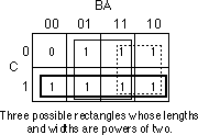 The next step is to draw rectangles around rectangular groups of ones. The rectangles you enclose must have sides whose lengths are powers of two. For functions of three variables, the rectangles can have sides whose lengths are one, two, and four. The set of rectangles you draw must surround all cells containing ones in the truth map. The trick is to draw all possible rectangles unless a rectangle would be completely enclosed within another. Note that the rectangles may overlap if one does not enclose the other. In the truth map below there are three such rectangles: