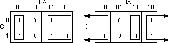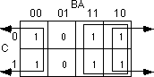 groups of ones in a map. Consider the boolean function F=C'B'A' + C'BA' + CB'A' +